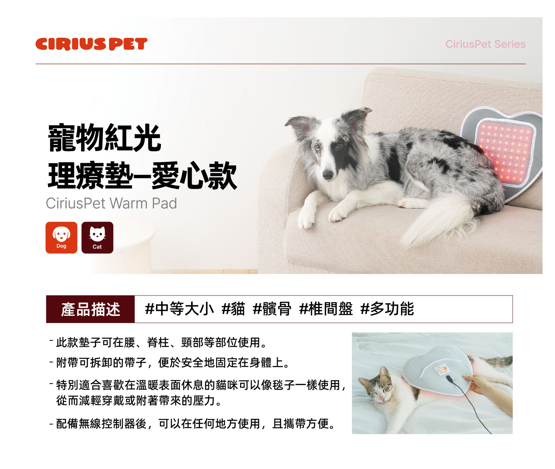 LLLT Warm Pad is a pet pain treatment device that utilizes LLLT (low level laser therapy) with near-infrared rays to penetrate deep into the body and provide targeted and comfortable warmth to the legs, hips, and spine. With 128 LED chips and three temperature levels, it ensures convenience and safety with its foldable, ultra-lightweight design and protective mesh.