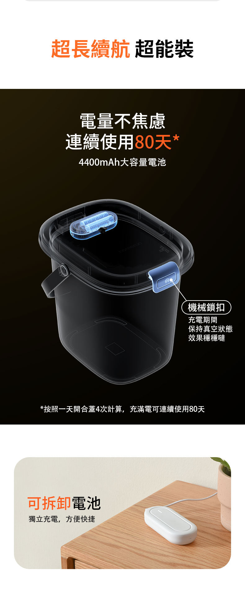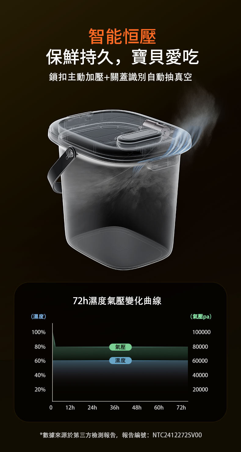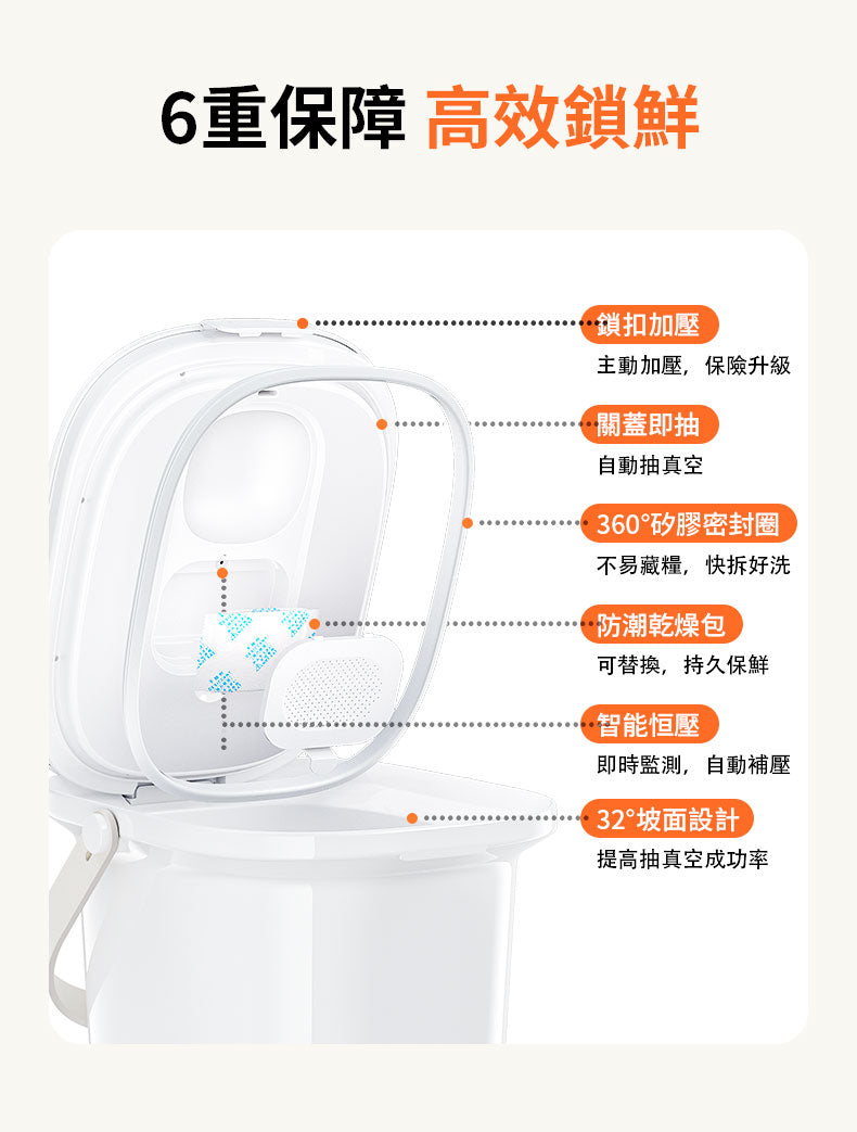 6-layer freshness protection – Locking latch, vacuum seal, 360° silicone ring, moisture-absorbing pack, smart pressure control, and 32° sloped design.
