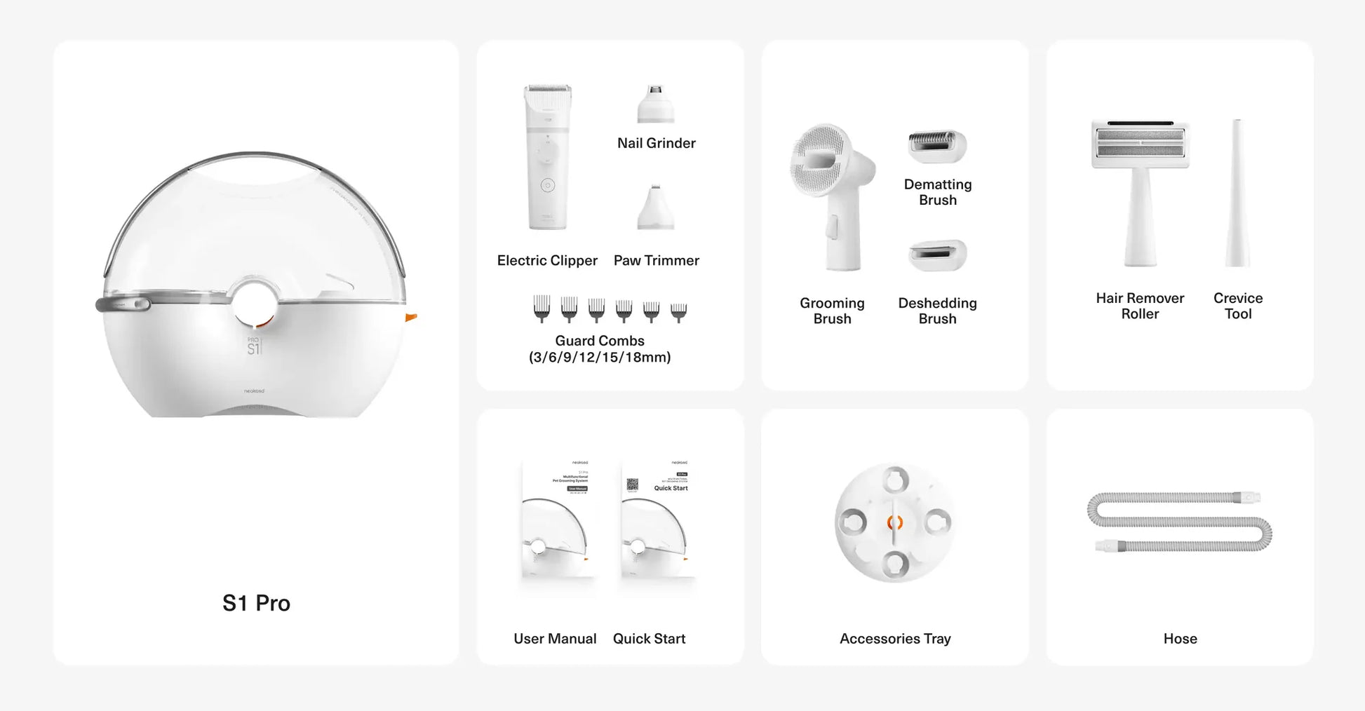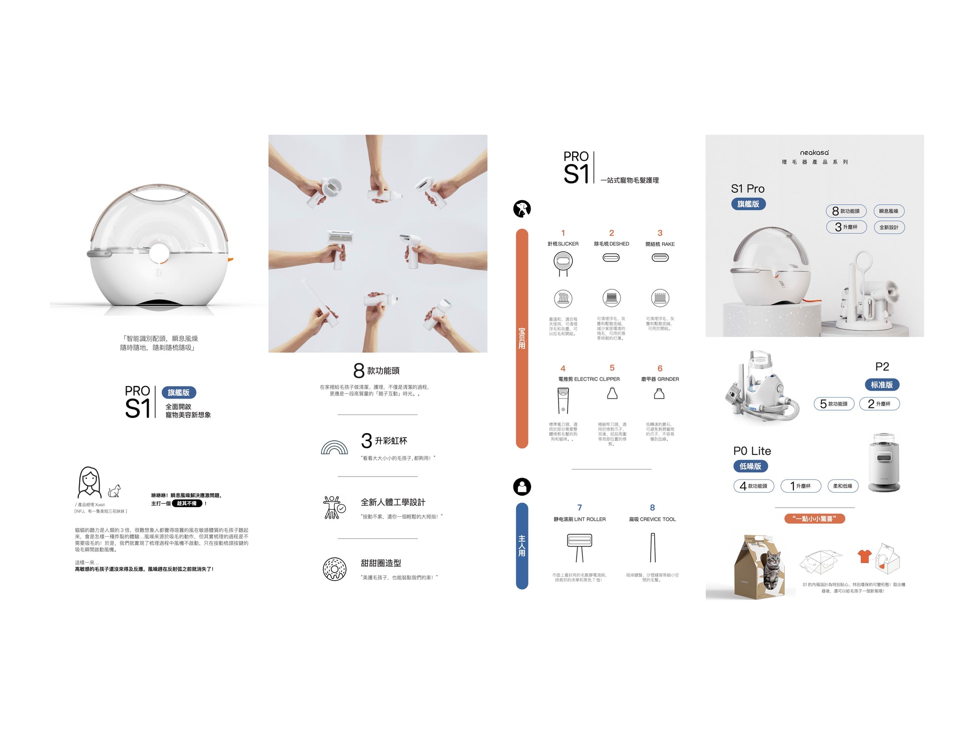 Neakasa S1 Pro 是一款吸塵套裝,配有多種寵物美容工具,包括8 個經過驗證的美容工具(針刷、兩個除毛工具、兩個電動剪刀頭、爪子修剪器、絨毛滾筒和縫隙工具)、6 個導梳,以及3L大容量除塵吸杯,11000pa強勁吸力,最低運行噪音50dB,一鍵吸風系統:無噪音梳理,適合各類毛皮寵物。除了幫助您保持寵物皮毛的健康外,還為您創造一個舒適的生活環境。