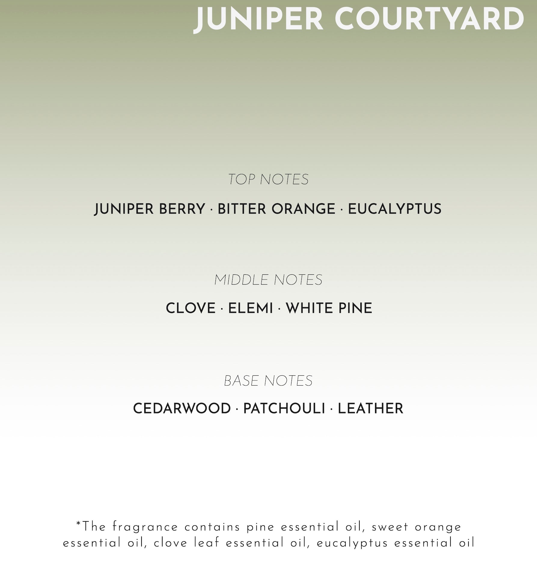 Juniper Courtyard: Juniper Berry, Bitter Orange, Eucalyptus, Clove, Elem, White Pine, Cedarwood, Patchouli, Leather