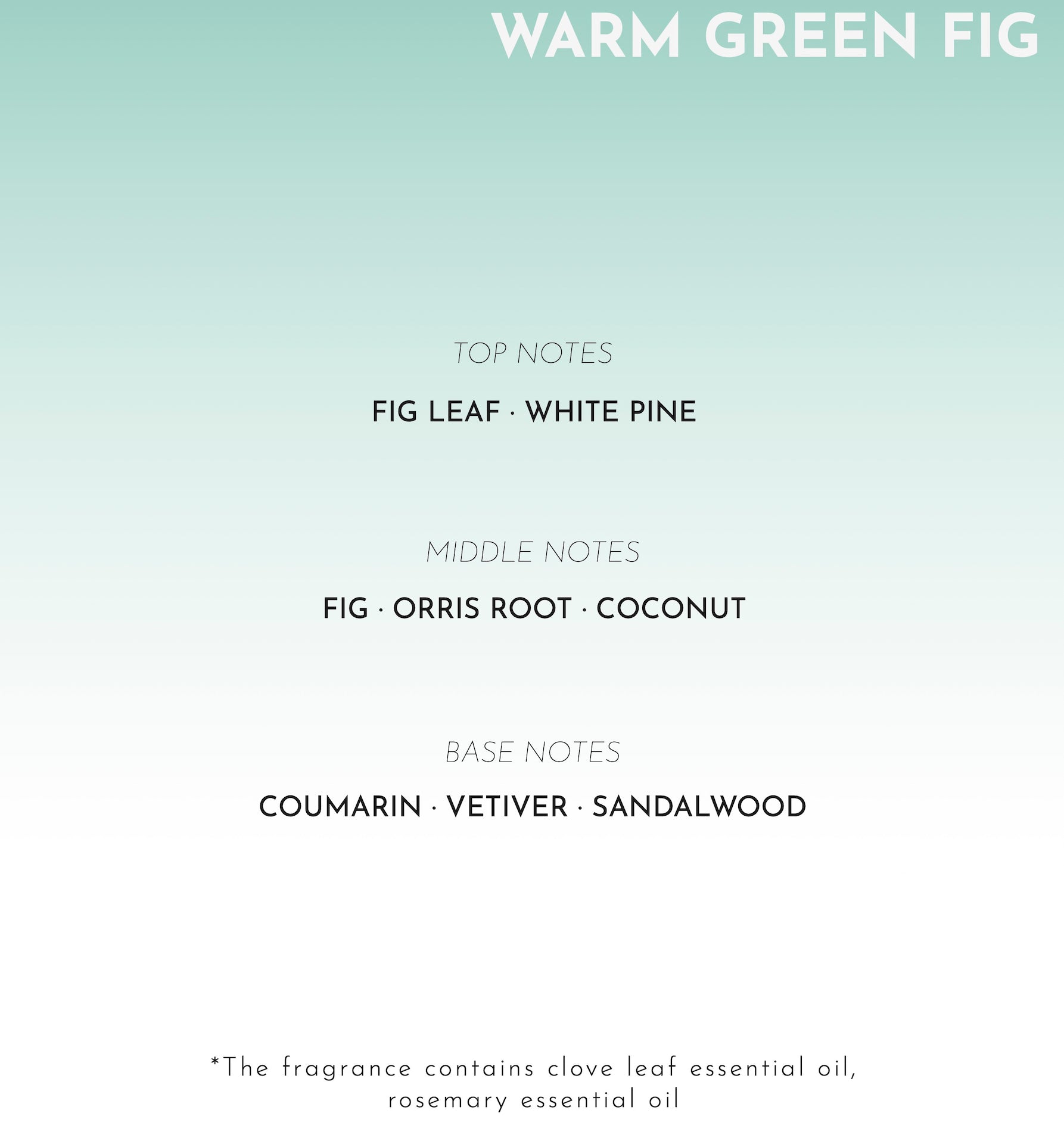 Warm Green Fig: Fig Leaf, White Pine, Fig, Orris Root, Coconut, Coumarin, Vetiver, Sandalwood